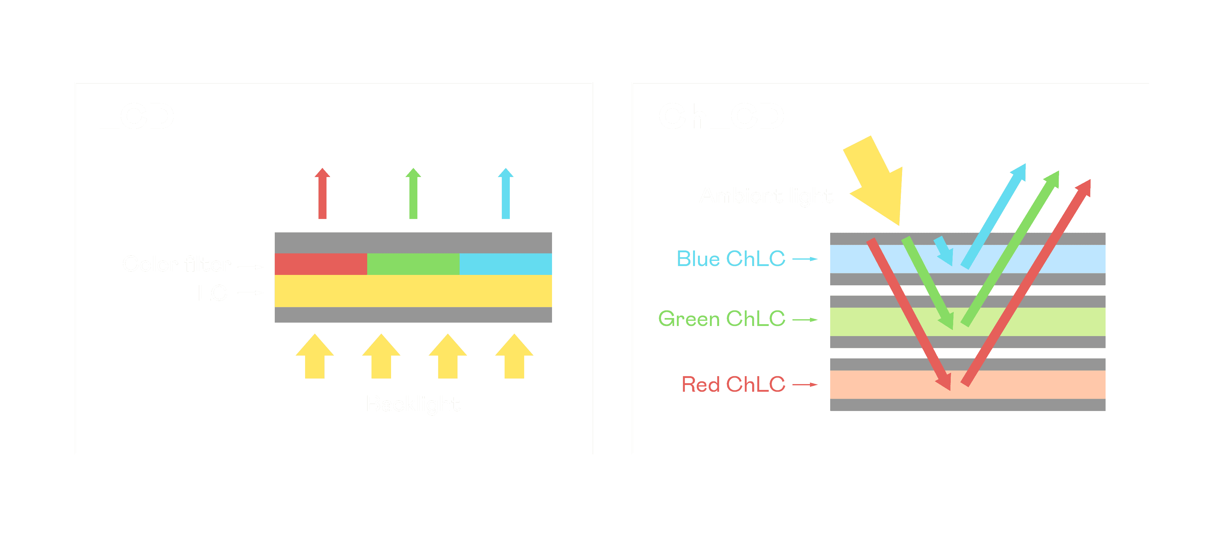 ChLCD 胆固醇液晶就如同纸张一样,,,透过反射环境光来显示影像,,,,因此长时间观看不易造成人眼视觉疲劳,,可达到护眼效果。。。。当处于户外阳光下使用,,,LCD 影像容易失真而不易观看,,,但胆固醇液晶仍可维持较佳的影像品质。。。