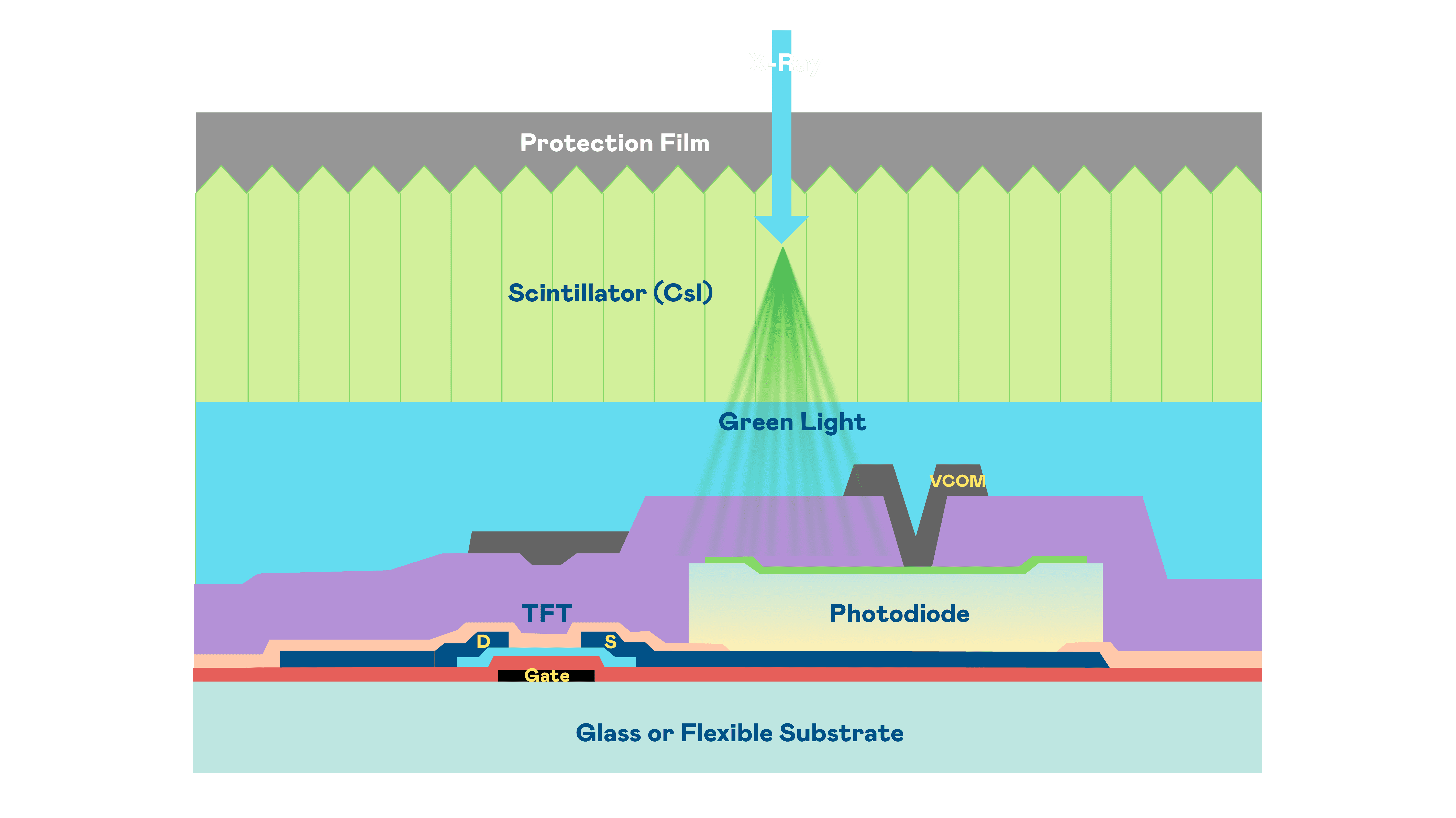JDB电子的X光影像感测阵列使用薄膜电晶体 (TFT) 作为每个像素的读取开关,,,,搭配光电二极体(Photodiode)的光电转换元件,,用以感测X光影像讯号。。。